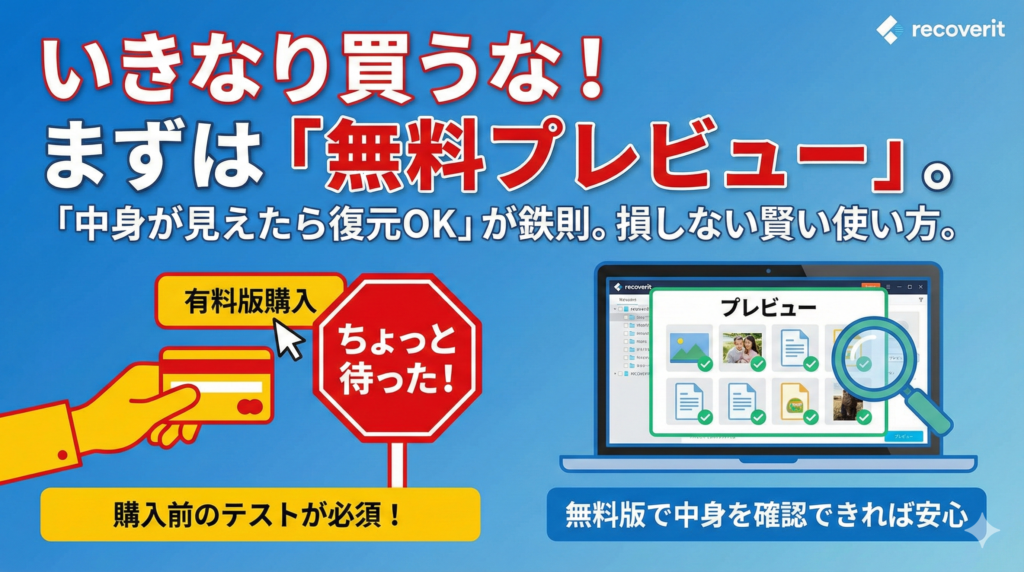本当に復元できるか不安な方は、まず無料版でスキャンを行い、プレビュー画面でファイルの中身が表示されるか確認してください。