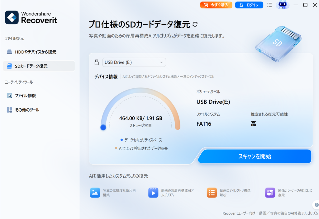 RecoveritはWindoesやMacはもちろん、SDカード、USBメモリなど幅広くデータ復元に対応したデータ復元ソフトです。