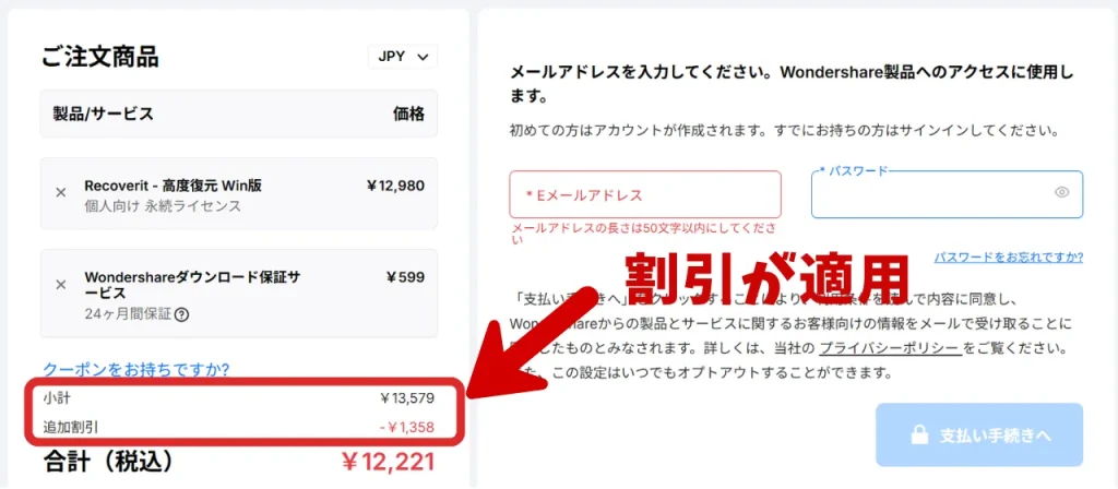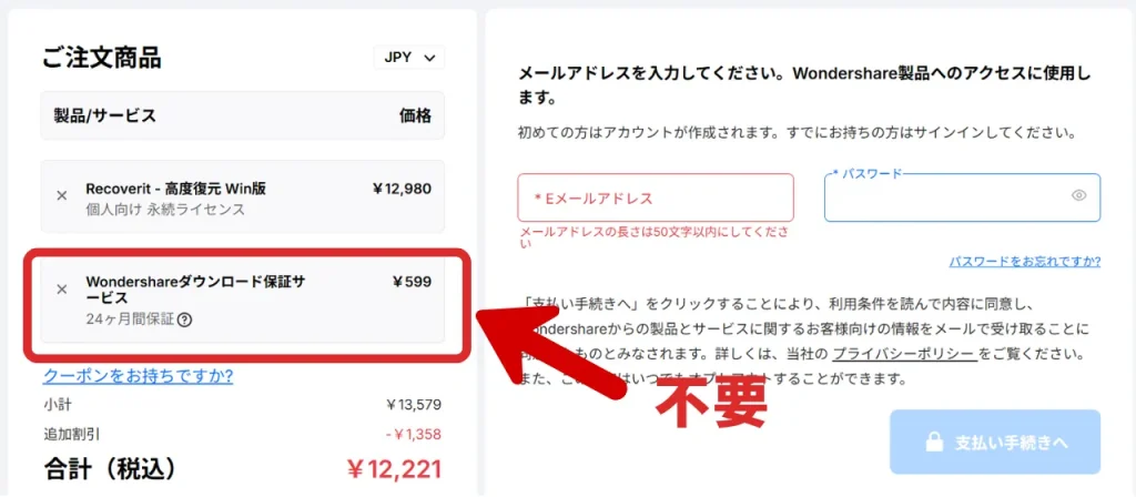 Recoveritをカートに入れると、「Wondershareダウンロード保証サービス」という有料オプションが自動的に追加されていますが、これは不要なため削除することをおすすめします。