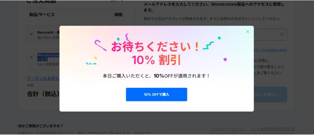 特に「カート放置クーポン」は、Recoveritをカートに入れたまま数分待つだけで、割引ポップアップが表示される裏技的な仕組みです(割引額はタイミングにより異なります)。
