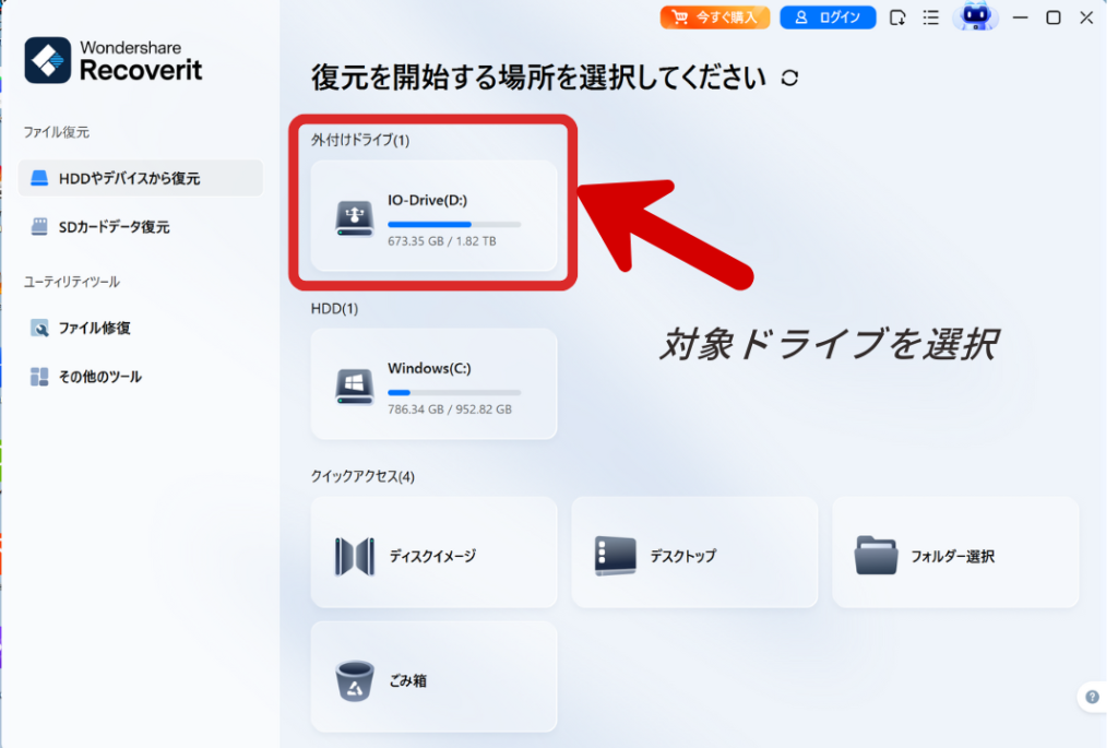 データ復元をしたいデバイスをパソコンに接続し、Recoveritを起動したら、画面上で対象デバイス(ドライブ)を選択します。